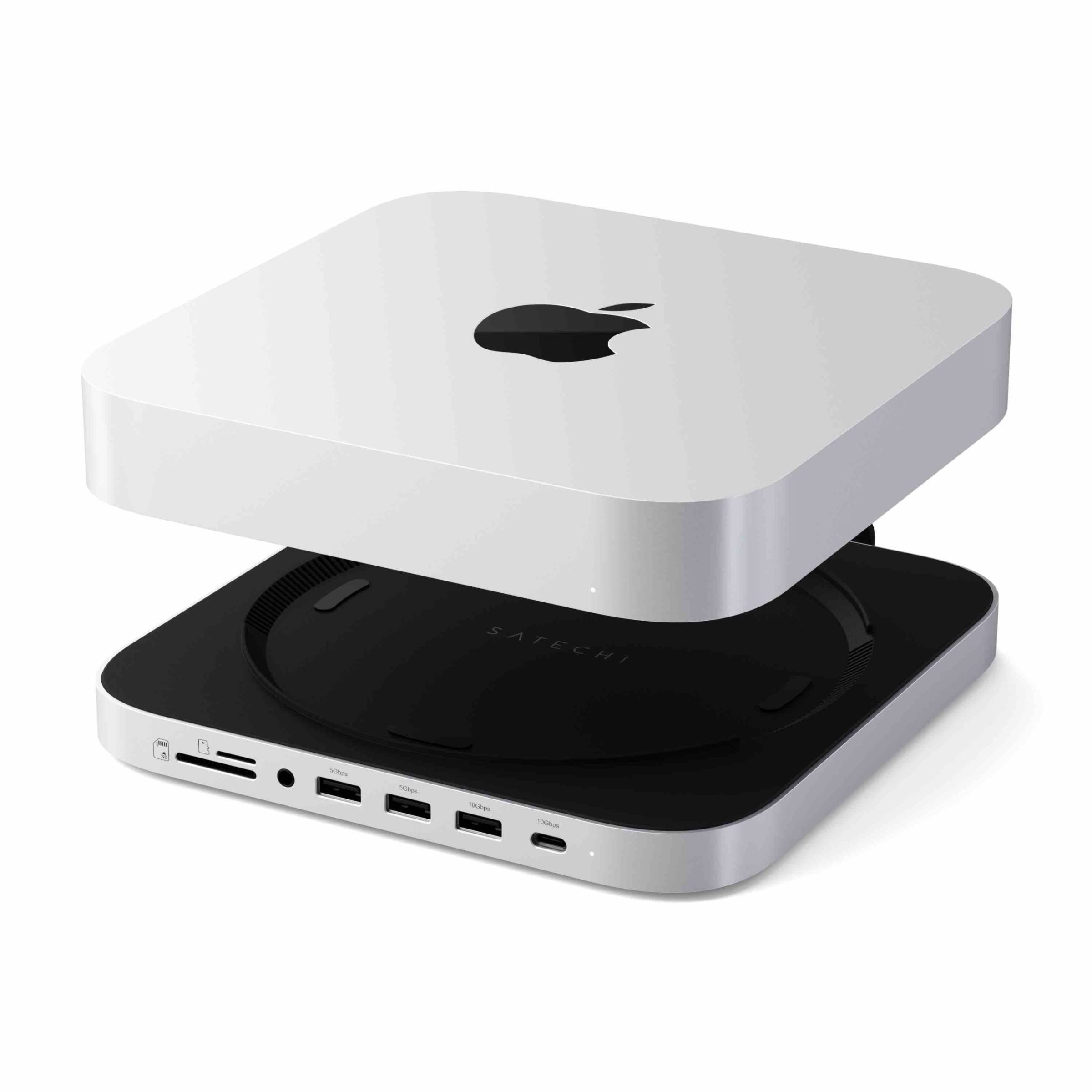 Satechi Stand & Hub For Mac Mini / Studio (1x USB-C 3.2, 1xUSB-A 3.2, 2x USB-A 3.0, 3.5mm Audio,1x Micro/SD, 1x NVMe/M.2 SATA SSD Enclosure Drive not included) – Silver